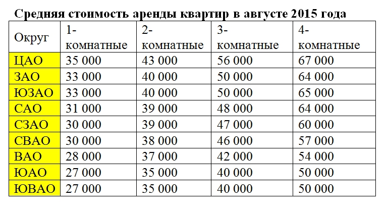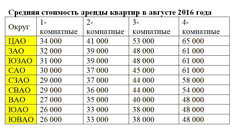 Средняя стоимость аренды квартир по округам